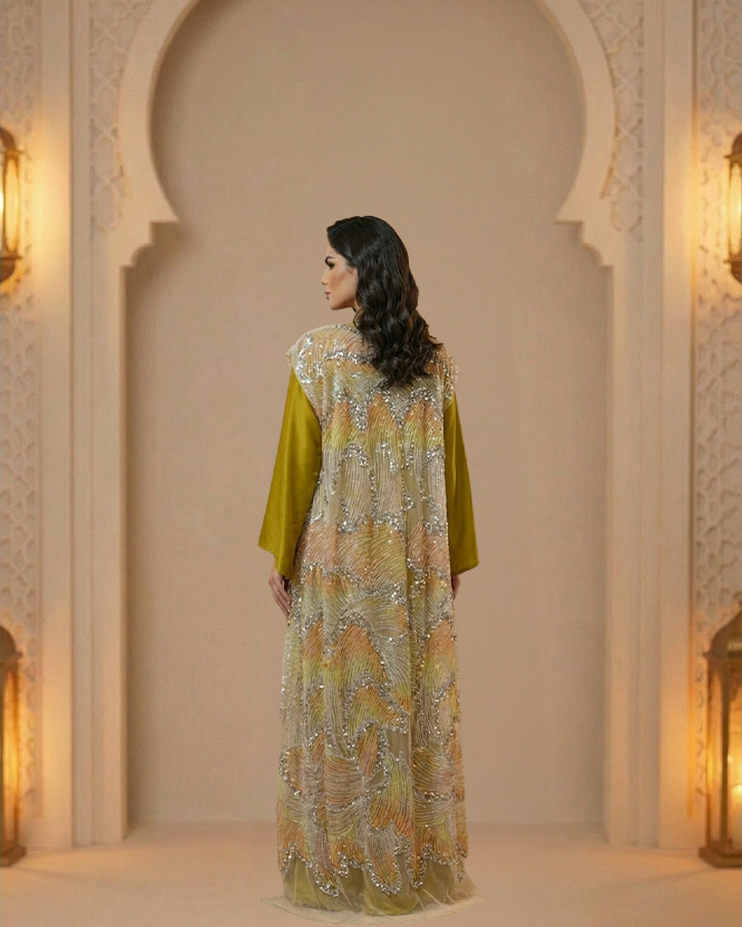 The set includes a plain satin inner abaya, providing comfort, coverage, and a smooth, elegant base beneath the embroidered organza layer. The combination of flowing organza and soft satin creates a graceful silhouette ideal for formal occasions and special events.